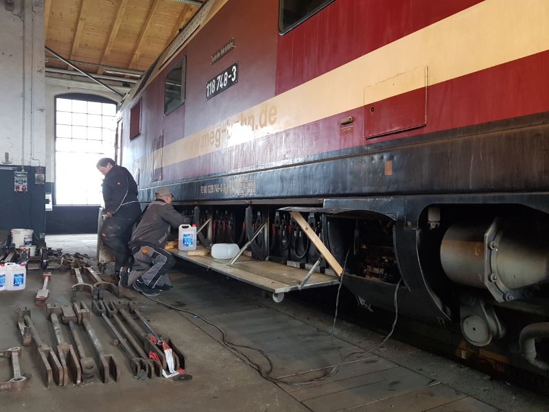 One of the big diesel locomotives is also undergoing some maintenance work. The starter batteries of 118 748 needed fresh distilled water again. After they were installed again today, the battery charger was connected. Maybe we can take the locomotive to the next event ... ?!