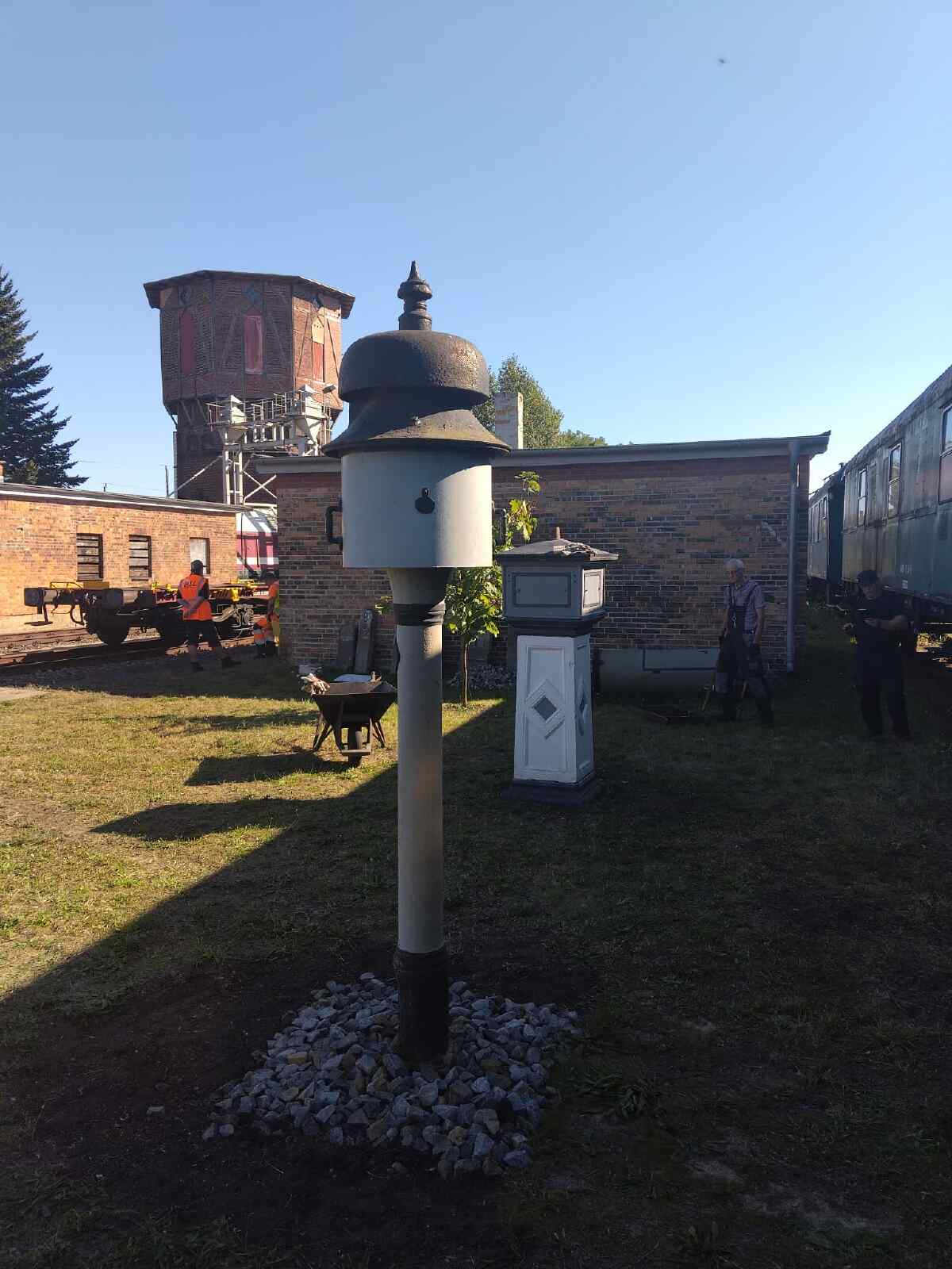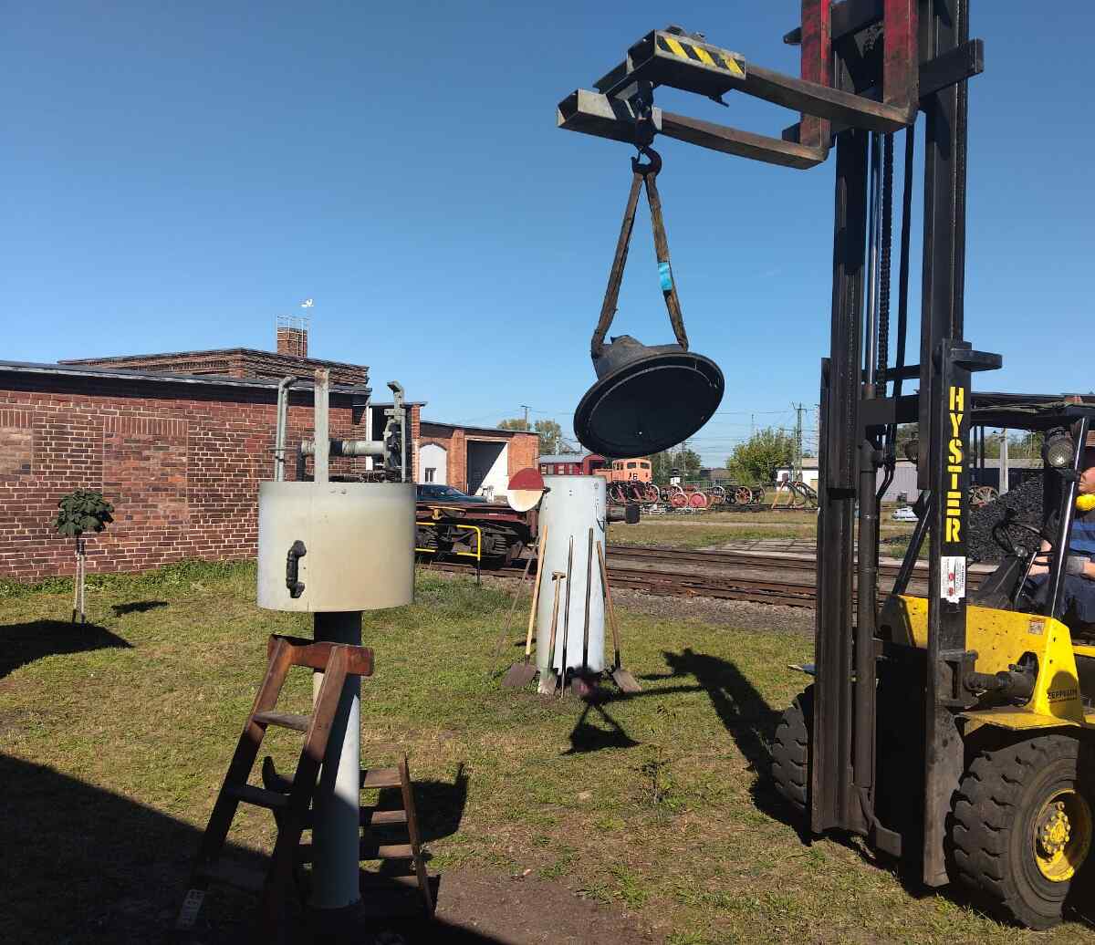 On Sunday, the nationwide Open Monument Day took place. We also took part in this event and were able to tell quite a few visitors about our activities to preserve our monument. Today we can also report on another small sensation. Unfortunately, the well-known Stendal specialist book author and railway enthusiast Wolfgang List passed away some time ago. However, we were able to come to an agreement with the family that our museum will take over and exhibit the extensive collection of bell mechanisms. These are various devices, some of them the size of telephone booths, which were used to signal incoming and outgoing trains by morse signals before the digitalisation of the railway. Wolfgang List had saved such equipment from being scrapped in many parts of Germany and restored it to working order in his private collection. Now the parts will be given their rightful place in Wittenberge. We would like to thank the relatives once again for their willingness to hand over the collection to us. A few days ago, we started to set up the large exhibits in our outdoor area.