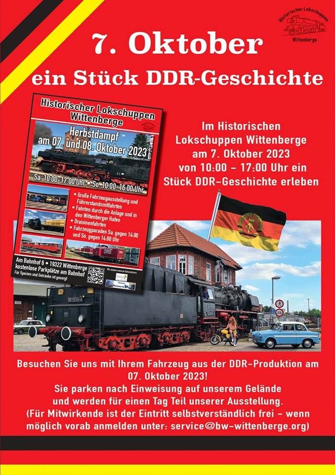 Now back to the initial topic, the looming autumn steam: We have already referred to the event itself. However, there are a few other highlights that need to be mentioned. First of all, there are the feeder trips to our steam days. On Saturday, 7 October, a special railcar from Neumünster will travel to Wittenberge, and on Sunday a railbus "Ferkeltaxe" from Neustrelitz. Tickets are still available. So if you would like to travel in style on one of these trains, you can find more information and bookings on our website www.dampflok-wittenberge.de and the website of our colleagues from Neumünster www.kulturlokschuppen.de. If you are travelling by car on Saturday, 7 October, and it was produced in the GDR, you have the opportunity to drive directly to the museum grounds and save the entrance fee. However, we ask for advance notification by email to service@bw-wittenberge.de.