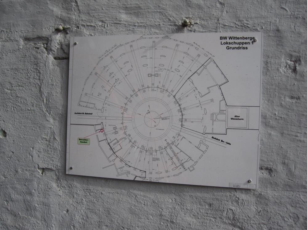 Wir befinden uns inzwischen auf dem Grundstück des ehemaligen Lokschuppens 1 des Bahnbetriebswerkes Wittenberge. Dabei handelte es sich um eine sogenannte Rotunde. Darunter versteht man einen runden, völlig geschlossenen Lokschuppen mit innenliegender Drehscheibe. Das Gebäude war sehr markant, weil es von einer riesigen Dachkuppel überspannt wurde. Diese Kuppel wurde in den 1980er Jahren durch einen Sturm zerstört. Das Gebäude selbst wurde Ende der 1990er Jahre abgerissen, weil Teile davon auf der Trasse der seinerzeit neu errichteten Gleisverbindung vom Bahnhof Wittenberge in Richtung Elbbrücke im Weg standen. Ein kleiner Teil steht noch in Fragmenten, weil er nachher noch als Pkw-Werkstatt und Garage genutzt wurde. Auf dem Plan erkennt man die ursprüngliche Anordnung der Gleise in diesem Gebäude. Die Lage der Drehscheibe ist heute noch durch einen kreisrunden Parkplatz zu erkennen.