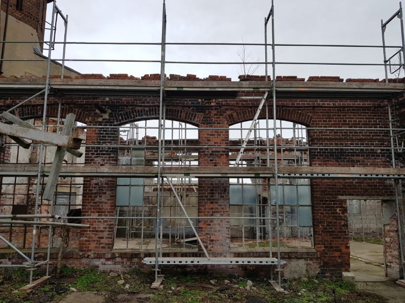 And finally to the work on the locomotive shed I. Finally the scaffolding has been erected, which makes it possible to work on the top of the wall. Since water has penetrated from above, the topmost layers must be removed and rebuilt. This will be carried out by a specialist company in due course. After that the roofers will come.