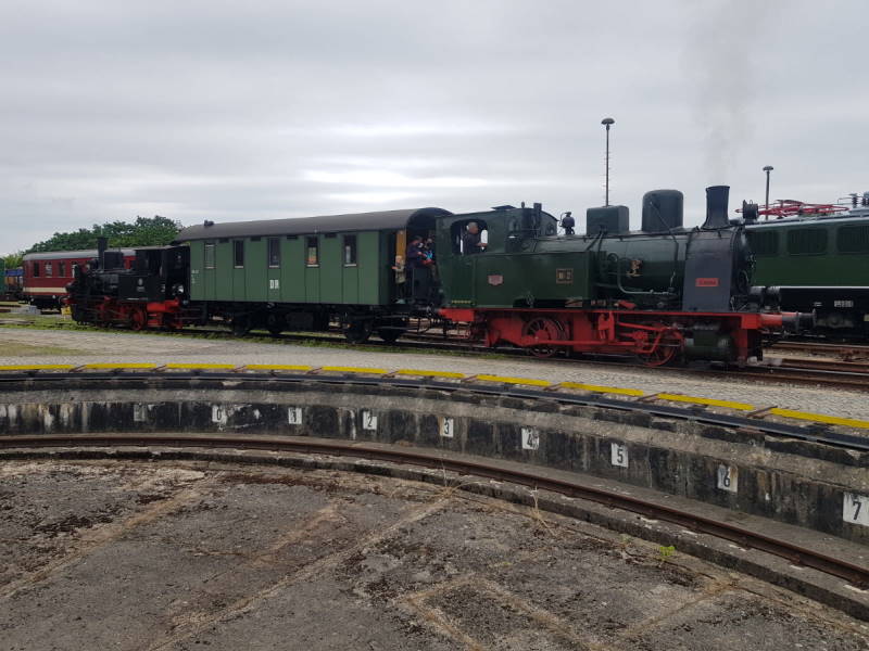 Erstmalig in der Geschichte unseres Museums haben wir auch Rundfahrten auf dem Museumsgelände mit einem kurzen Museumszug angeboten. Die Idee war eigentlich aus der Not heraus entstanden, dass wir mit unseren kleinen Dampfloks aufgrund des Abstandsgebotes keine Führerstandsmitfahrten anbieten konnten. Also haben wir zwischen die beiden kleinen Loks einen historischen Personenwagen aus dem Jahr 1900 gekoppelt, in dem unsere Besucher das Fahrgefühl der Marke „Holzklasse“ erleben und von den Bühnen auch mal einen Blick in die Führerstände der Loks werden konnten. Der Wagen bot ausreichend Platz und gute Möglichkeiten der Durchlüftung.