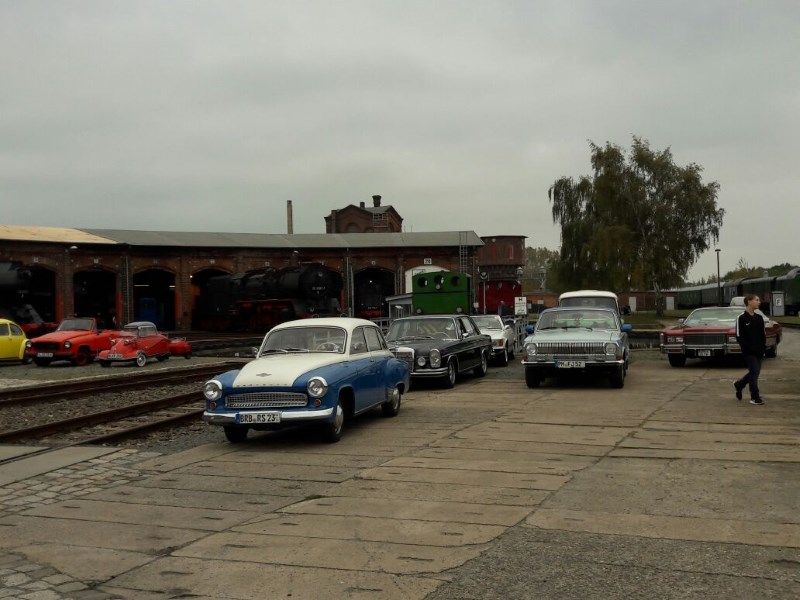 The old-timer friends from Potsdam took advantage of the beautiful autumn weather to take a trip to the Prignitz. One stop of the trip was at the Historischer Lokschuppen Wittenberge, where people and machines took a break. While the participants took a guided tour through the collection, the vintage cars sunbathed on the apron.