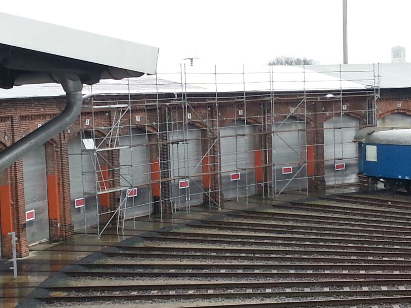 After the past two storms, we are working on repairing the damage. On the one hand, the storms ripped off extensive areas of the roofing felt that protects our engine shed from rainwater. In the next few days, about 750 square metres of roofing felt will have to be newly applied. To protect the roofers, a scaffold was erected in front of the part of the building affected.