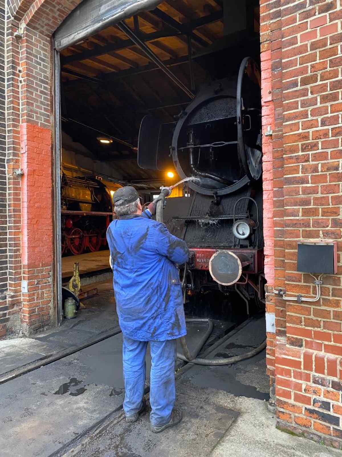Am heutigen Samstag war das Museum letztmalig regulär in diesem Jahr geöffnet. Diese Gelegenheit nutzten etliche Besucher, um uns noch einen Besuch abzustatten. Vielen Dank für Ihr Kommen in diesem Jahr. Die Aktiven waren damit beschäftigt, einige Lokomotiven auf den Winter vorzubereiten. So wurden alle Dampfloks ausgeschlackt und ihre Feuerkisten und Rauchkammern gründlich gereinigt. Bei der Dampflok Emma wurde zudem der Kessel ausgewaschen, weil sich während des Betriebs Kalkrückstände an seiner Innenseite ablagern. Sie kennen das vielleicht von ihrem Wasserkessel oder dem Heizstab ihrer Waschmaschine daheim. Der Kalk muss von Zeit zu Zeit entfernt werden. Dazu werden alle Waschluken im Kessel geöffnet und der Kessel mit einem scharfen Wasserstrahl ausgewaschen. Das folgende Bild zeigt den Kollegen beim Öffnen einer Luke auf der Oberseite des Kessels