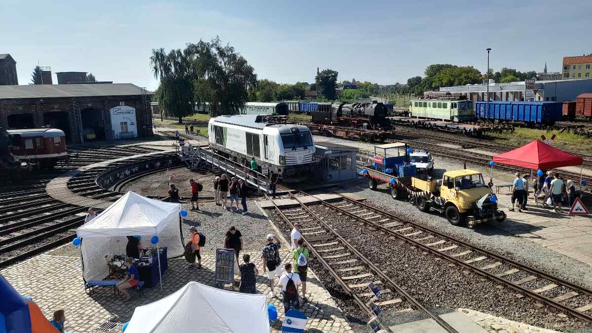 What else happened? We had three events to attend last weekend and that was quite exhausting, not only because of the summery weather. On 9.9, our neighbours, the Schienenfahrzeugwerke Wittenberge, opened their doors to interested visitors. Of course we supported them, because we actually share the grounds of the former Wittenberge railway depot. We also think that we complemented each other well, because the SfW showed modern technology, while we showed historical technology.