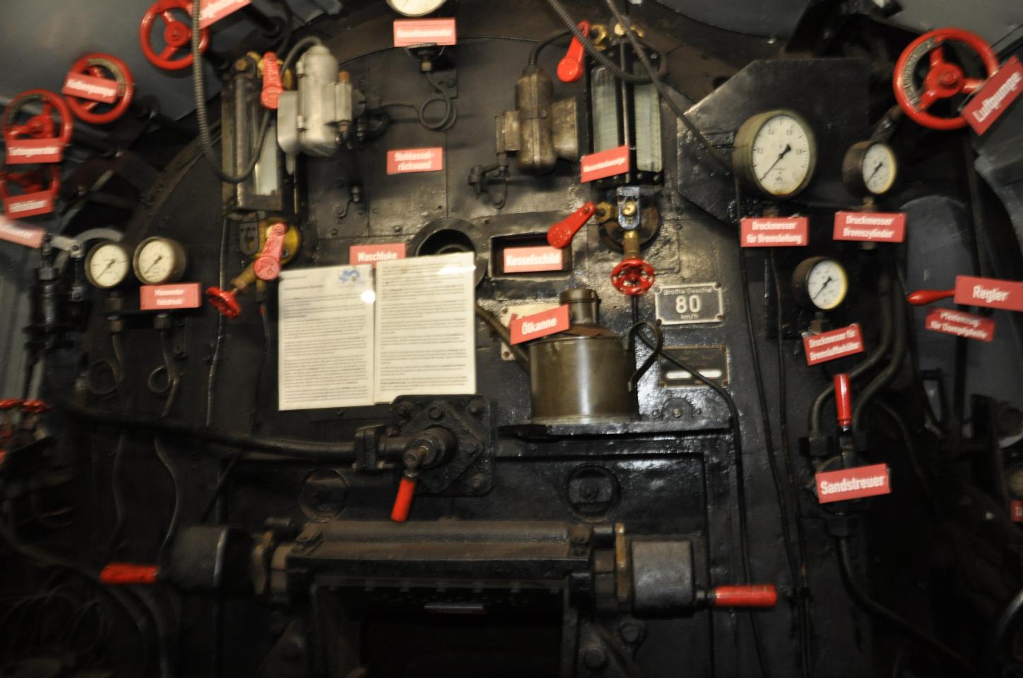 Und wer noch nicht genug vom Führerstand hat, der kann im Lokschuppen ganz intensiv betrachten, mit welchen Armaturen und welcher Technik der Führerstand einer Dampflok ausgestattet ist.