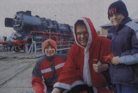 von Nico BindeEine Sinfonie in Schwarz, Rot und Weiß: Farblich bestens aufeinander abgestimmt waren am Sonnabend der Nikolaus (Dennis Alexander Berg) und die Schwarze Lady im Hintergrund. Auch Markus Goebel (links) und Lukas Rasmus staunten nicht schlecht, als aus dem Wagen, der hinter die Dampflok gespannt war, ein Mann mit rotem Umhang und Rute stieg. Sie hatten allerdings weniger Augen für die farbliche Abstimmung. Sie interessierte vielmehr, was der Nikolaus in seinem Sack hatte. Um es vorweg zu nehmen: Es waren Gummibärchen. Lukas ist übrigens echter Eisenbahnfan. Beim Einfahren der Lok referierte er über Baujahr und Typ-Nummer.